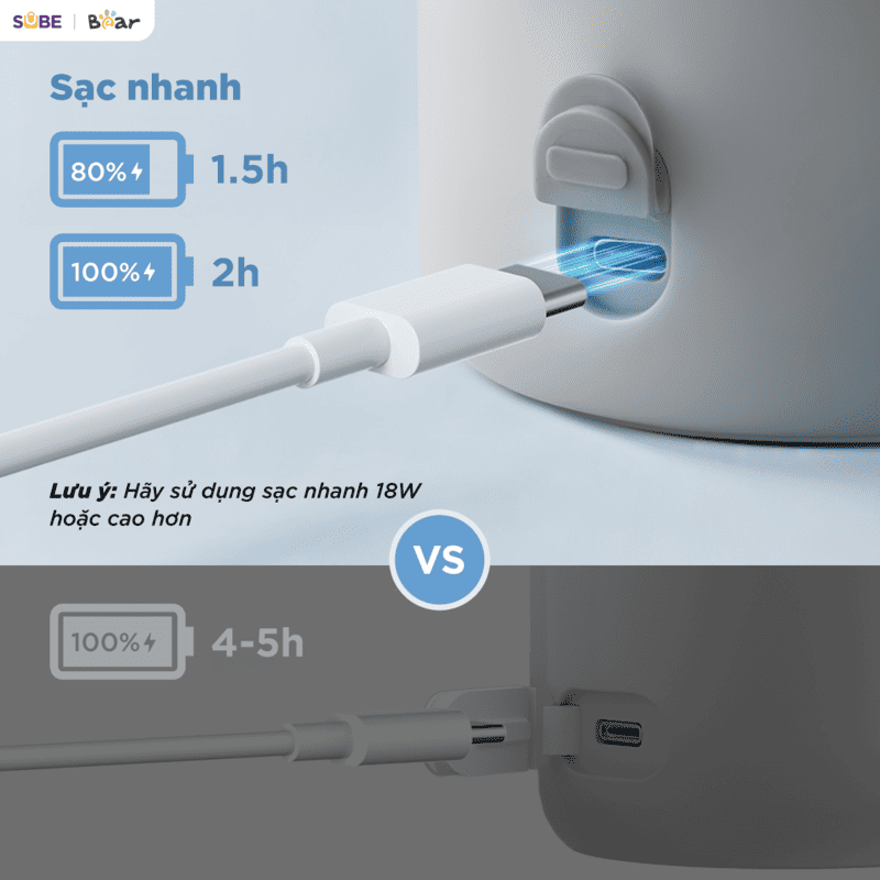 Trong khi các dòng bình đun di động khác trên thị trường thường mất từ 4-5 giờ để sạc đầy, bình đun và hâm nước pha sữa di động mini 0.5L Bear BKL-055EJ giúp bạn tiết kiệm một nửa thời gian. Cổng sạc Type-C phổ biến cũng giúp mẹ dễ dàng dùng chung dây sạc với điện thoại, laptop, giảm bớt số lượng dây cáp phải mang theo.