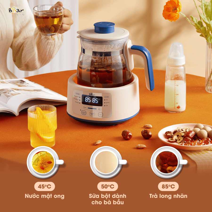 - Đáp ứng nhu cầu đa dạng cho mẹ và bé: Máy hâm sữa không chỉ phục vụ bé như pha sữa, hâm sữa và chuẩn bị bột ăn dặm mà còn đáp ứng nhu cầu của mẹ như đun nước ấm, pha trà hoặc pha mật ong.