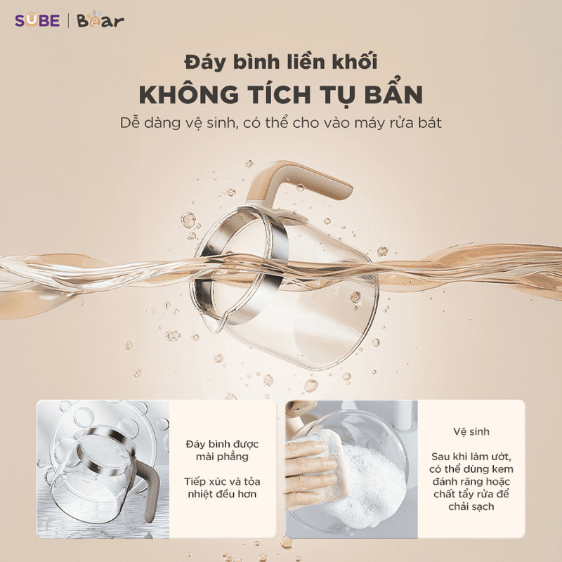 - Thân ấm thủy tinh liền khối, miệng rộng: Thiết kế thân ấm liền khối, không có khe hở ở đáy, cùng với miệng ấm rộng giúp việc vệ sinh trở nên dễ dàng, nhanh chóng và sạch sẽ hơn bao giờ hết. Mẹ có thể dễ dàng đưa tay vào cọ rửa hoặc sử dụng máy rửa chén để làm sạch.