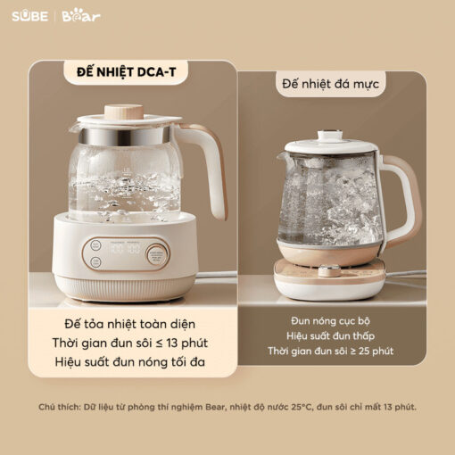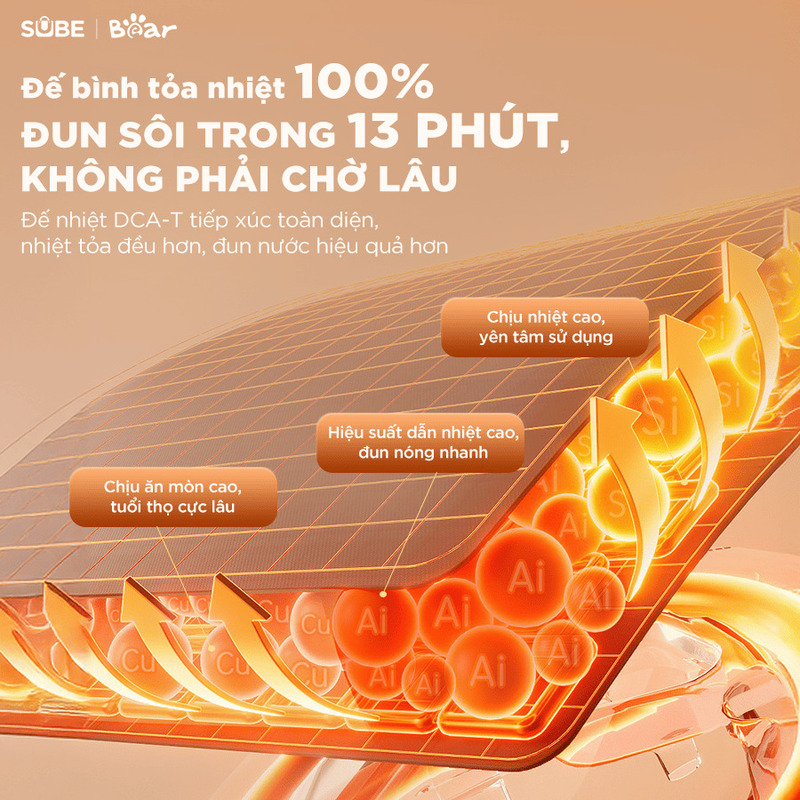 - Mâm nhiệt DCA-T tiên tiến: Công nghệ mâm nhiệt DCA-T giúp gia nhiệt đều khắp toàn bộ đáy ấm. Nhiệt lượng được tỏa đều, giúp nước nóng nhanh hơn và quan trọng là tránh tình trạng nứt vỡ do nhiệt không đều thường gặp ở các loại mâm nhiệt cục bộ, tăng độ bền cho sản phẩm.