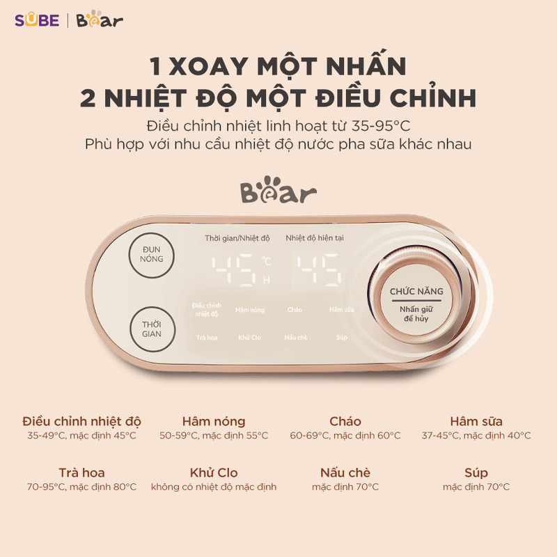 | 2 | Điều chỉnh nhiệt độ | 45°C | 45°C | – | Giữ ấm nước ở 45°C, phù hợp để uống, pha sữa cho bé |