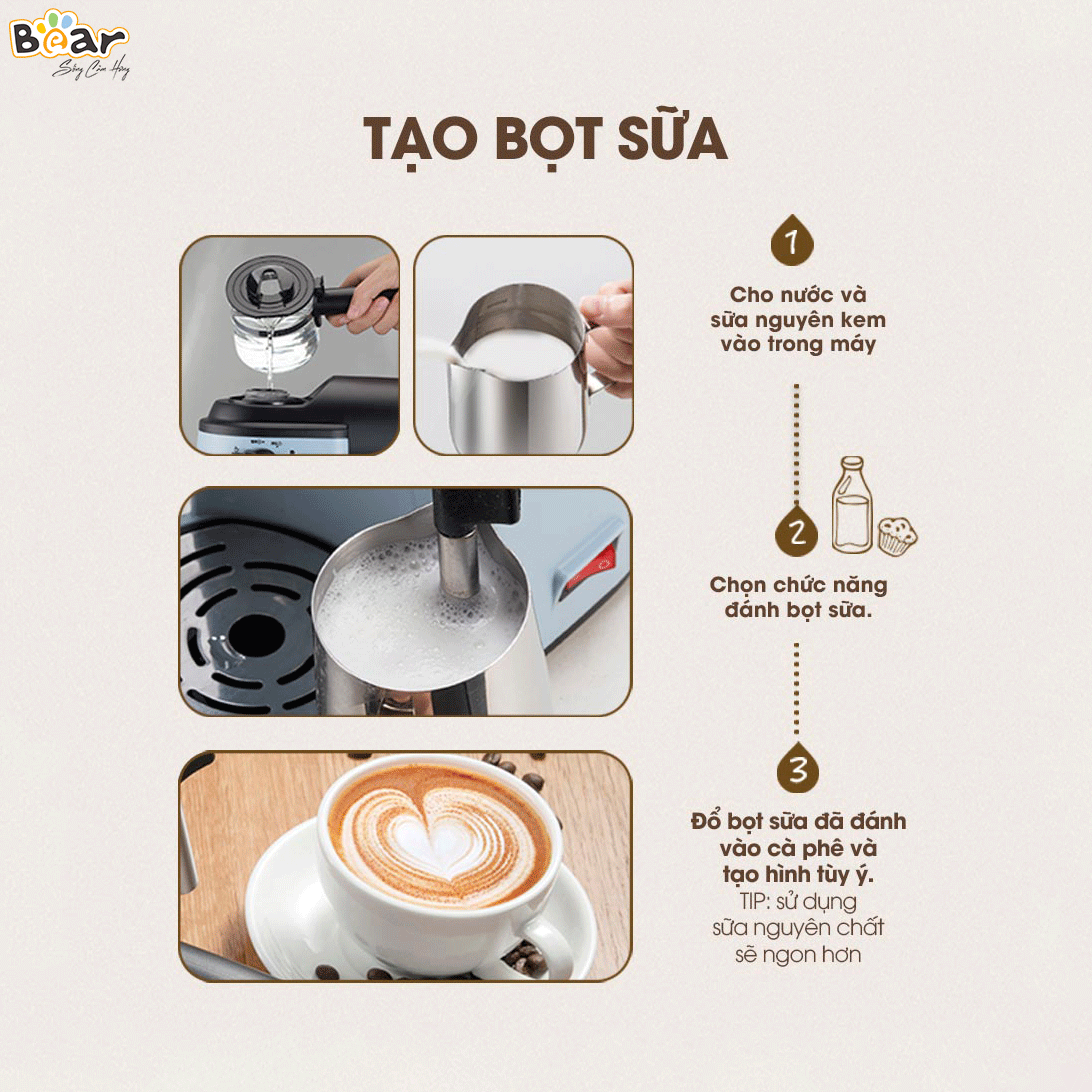 - Biến tấu đa dạng thức uống: Với Bear CF-B02V1, bạn có thể dễ dàng điều chỉnh lượng bọt sữa theo ý muốn để tạo ra nhiều loại thức uống khác nhau. Từ Cappuccino đậm đà, Latte ngọt ngào đến Macchiato béo ngậy, mọi thức uống đều trở nên đơn giản hơn bao giờ hết.