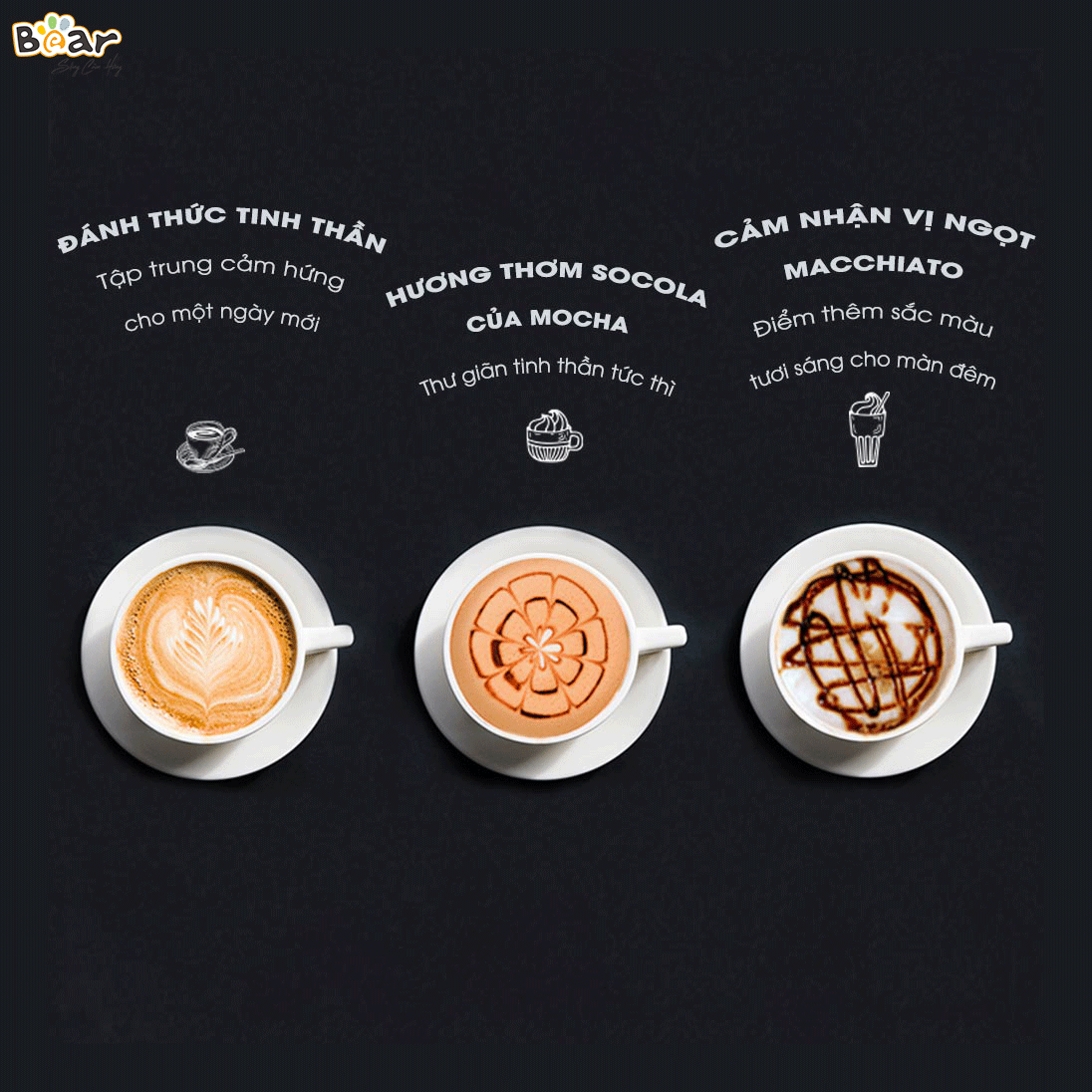 - Thỏa sức sáng tạo: Lớp bọt sữa mịn màng, bông xốp được tạo ra từ Bear CF-B02V1 chính là "nguyên liệu" lý tưởng để bạn trổ tài Latte Art. Hãy thỏa sức sáng tạo và trang trí cho tách cà phê của mình những hình vẽ độc đáo, thể hiện cá tính riêng.