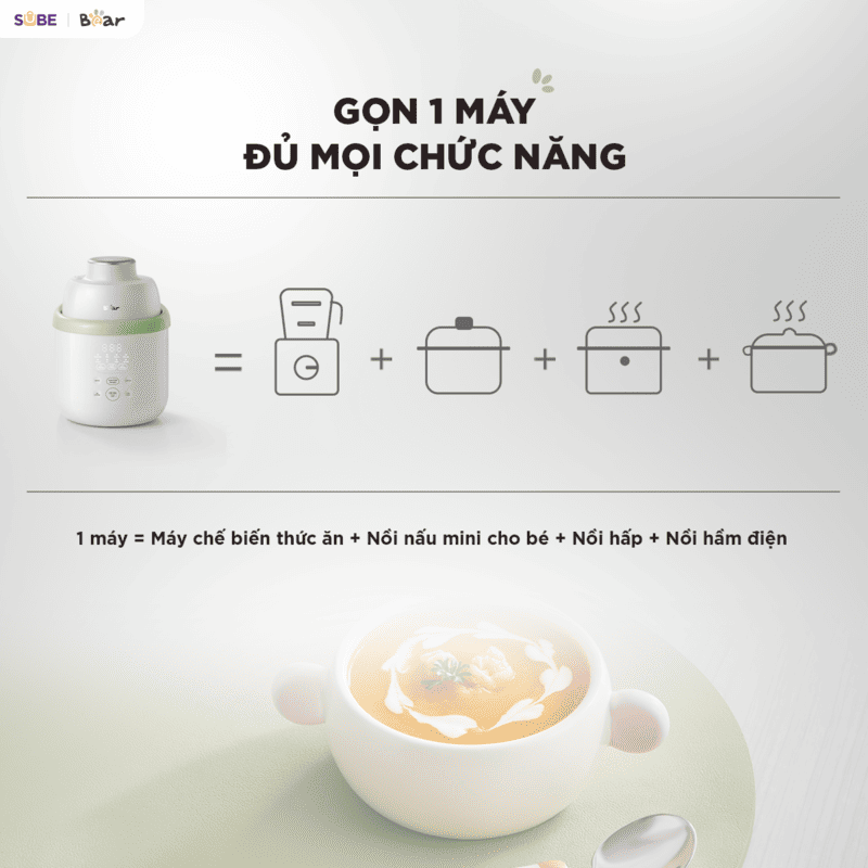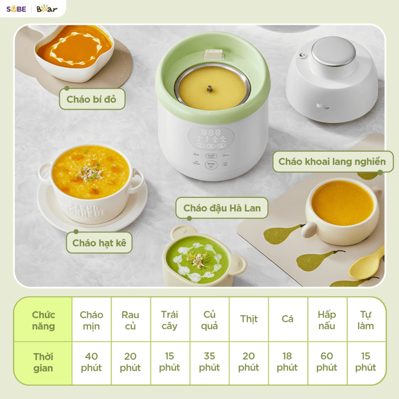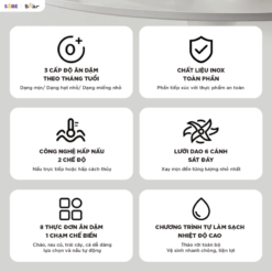 Không chỉ dừng lại ở việc hấp – nấu – xay thực phẩm, máy xay ăn dặm Bear BFM-045KN còn được thiết kế với các chế độ vận hành khoa học, giúp mẹ dễ dàng chuẩn bị thực đơn đa dạng theo từng giai đoạn ăn dặm của bé. Dựa trên bảng chức năng tích hợp sẵn, mẹ có thể chủ động lựa chọn chế độ phù hợp với từng loại nguyên liệu, đảm bảo món ăn đạt độ chín, độ mềm và độ mịn tối ưu. Dưới đây là các chức năng chính của máy cùng những món ăn gợi ý để mẹ áp dụng hằng ngày, vừa tiết kiệm thời gian vừa đảm bảo dinh dưỡng cho bé.
