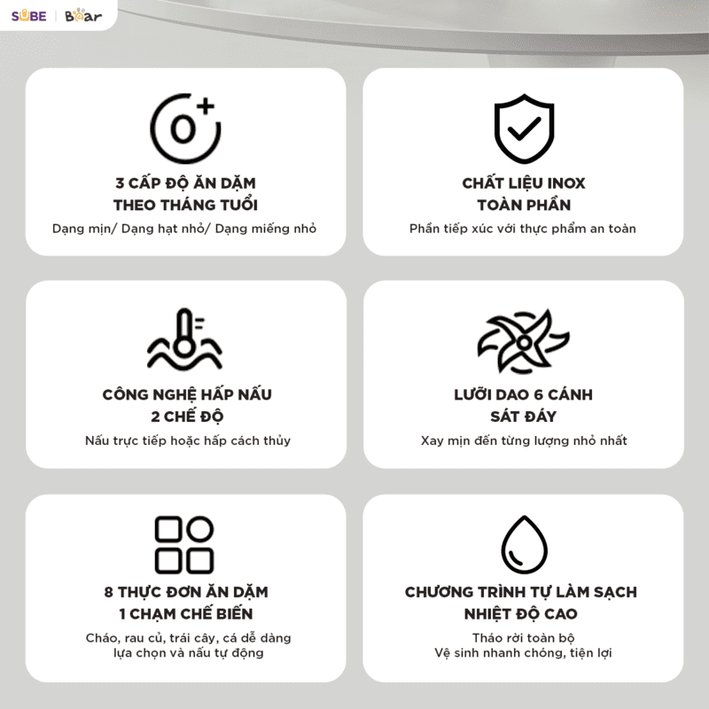 Với sự đầu tư về chất liệu inox 304 và 316 chuẩn an toàn thực phẩm, cùng thiết kế dễ vệ sinh và vận hành ổn định, Bear BFM-045KN trở thành lựa chọn đáng tin cậy cho mọi gia đình có trẻ nhỏ.