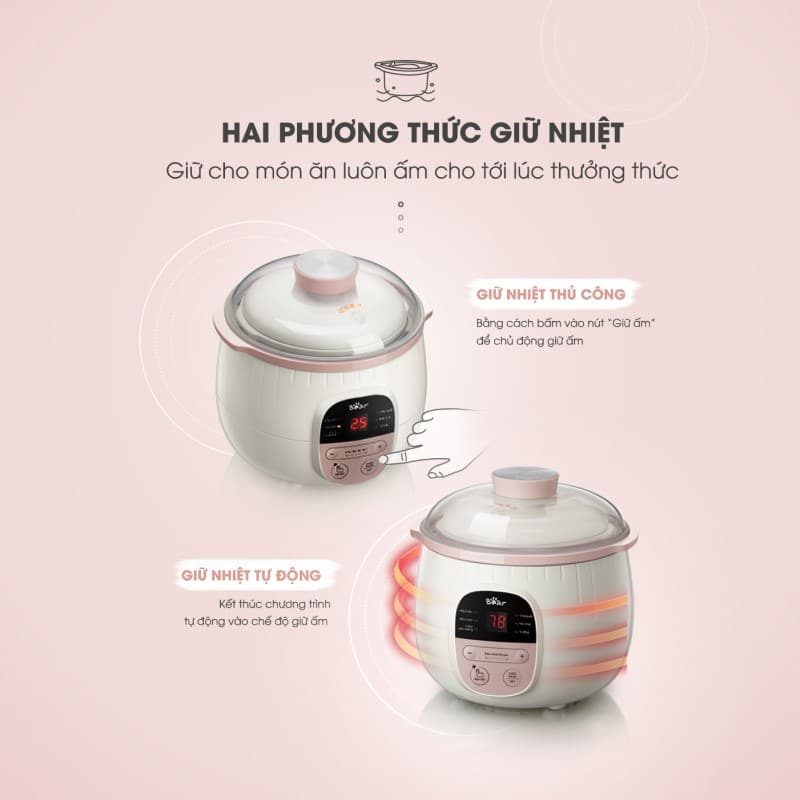 Nồi nấu chậm có thời gian Giữ ấm từ 8-12 giờ, nên nếu sử dụng chức năng này, mẹ có thể bảo quản cháo trong nồi nấu chậm từ 8-12 giờ. Nồi sẽ duy trì nhiệt độ trong khoảng 60 – 70°C, giúp cháo luôn ấm nóng, thơm ngon trong thời gian dài mà không bị cháy khét. Đây là một giải pháp tuyệt vời cho những ai bận rộn hoặc muốn chuẩn bị sẵn cháo cho bé ăn dặm.