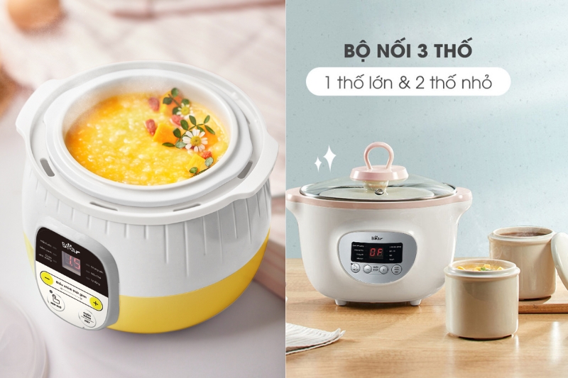 • Nồi nấu chậm 1.6L: Dung tích lớn hơn cho phép mẹ nấu nhiều món cùng lúc, thường có 1 thố lớn và 2 thố nhỏ đi kèm. Mẹ có thể nấu cháo cho bé ở thố lớn, đồng thời chưng yến hoặc nấu chè hoặc nấu nước dashi ở thố nhỏ – một công đôi việc.