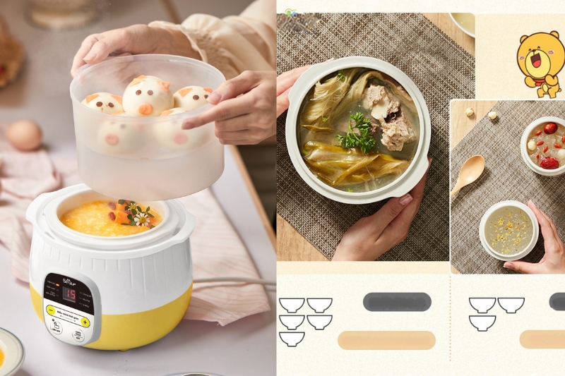 • Nồi nấu chậm 0.8L: Thường có 1 thố 1 xửng hấp nhỏ gọn vừa đủ cho một lần ăn, có thể hấp trên hầm dưới. Mẹ có thể nấu cháo cho bé ở thố sứ bên dưới, đồng thời hấp một ít rau củ, trứng hoặc bánh flan ở xửng hấp bên trên.