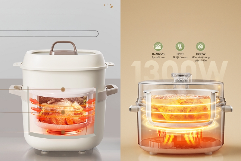 • Lợi ích chính: Tiết kiệm thời gian nấu tối đa (giảm 50-70%), làm mềm thực phẩm cứng/dai hiệu quả, tiết kiệm năng lượng (do thời gian nấu ngắn).