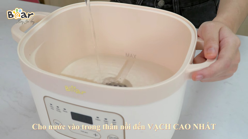 Bước 1: Đổ nước vào thố sứ và thân nồi