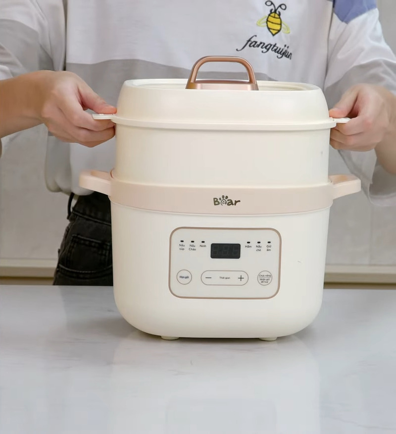 - Phương pháp nấu 2 trong 1 tiện lợi: Điểm đặc biệt của nồi nấu chậm là khả năng nấu hai món cùng lúc. Bạn có thể tận dụng nồi để vừa nấu cháo hoặc hầm canh ở bên dưới, đồng thời hấp các loại rau củ ở phía trên. Điều này giúp bạn tiết kiệm đáng kể thời gian và điện năng, đồng thời mang đến một bữa ăn đa dạng và đầy đủ dinh dưỡng chỉ với một thiết bị duy nhất.