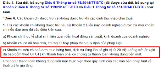 • Thanh toán tiền mặt trên 20 triệu đồng sẽ không được tính vào chi phí hợp lệ khi quyết toán thuế.