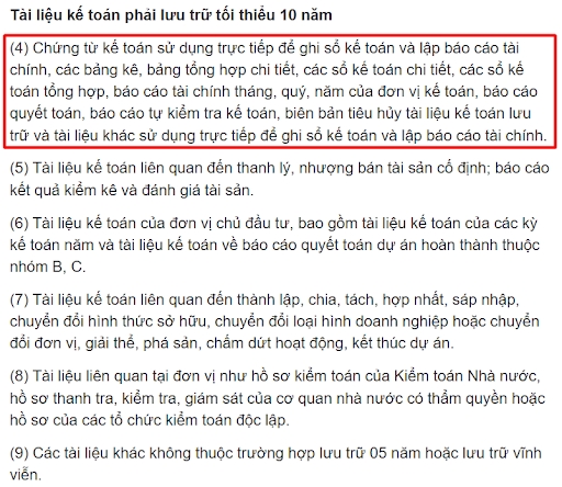 Các chứng từ này cần lưu giữ tối thiểu 10 năm theo quy định của Luật Quản lý thuế.